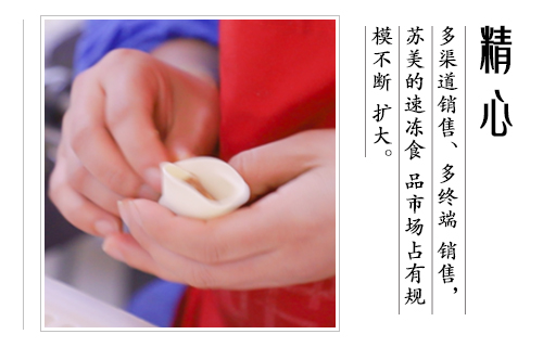 公司產(chǎn)品涵蓋速凍水餃(含手工水餃和大餡水餃)、速凍餛飩、速凍湯圓等三個(gè)系列、30多個(gè)花色品種,主要產(chǎn)品在華東、華西、華北的市場(chǎng)占有率達(dá)18%以上,其中蘇美的芹菜豬肉水餃、韭菜雞蛋水餃以其獨(dú)特的口感,大受消費(fèi)者好評(píng),成為了新晉的網(wǎng)紅美食.